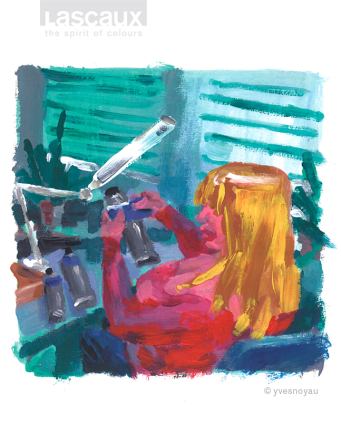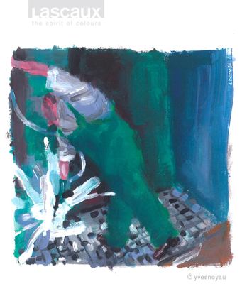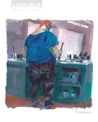 Der Schweizer Illustrator und Künstler Yves Nussbaum (Noyau) hat 2008 den Lascaux-Arbeitsalltag vor Ort in seinen ausdrucksstarken, mit Gouachefarben gemalten Bildern eingefangen. Diese haben bis heute nicht an Aktualität verloren, denn die Qualität unserer handwerklichen Herstellungsprozesse hat sich seither nicht verändert. Die expressiven Illustrationen begleiten unsere Serie über Werthaltungen, Arbeitsweise und Produkt-Philosophie von Lascaux.