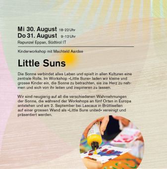 und sich von ihr leiten und inspirieren zu lassen.Wir sind neugierig auf all die verschiedenen Wahrnehmungen der Sonne, die während der Workshops an fünf Orten in Europa entstehen und am 2. September bei Lascaux in Brüttisellen auf einer grossen Wand als «Little Suns united» vereinigt und präsentiert werden.