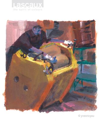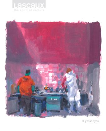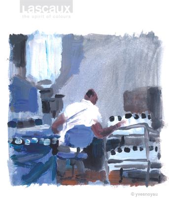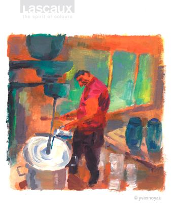 Der Schweizer Illustrator und Künstler Yves Nussbaum (Noyau) hat 2008 den Lascaux-Arbeitsalltag vor Ort in seinen ausdrucksstarken, mit Gouachefarben gemalten Bildern eingefangen. Diese haben bis heute nicht an Aktualität verloren, denn die Qualität unserer handwerklichen Herstellungsprozesse hat sich seither nicht verändert. Die expressiven Illustrationen begleiten unsere Serie über Werthaltungen, Arbeitsweise und Produkt-Philosophie von Lascaux.